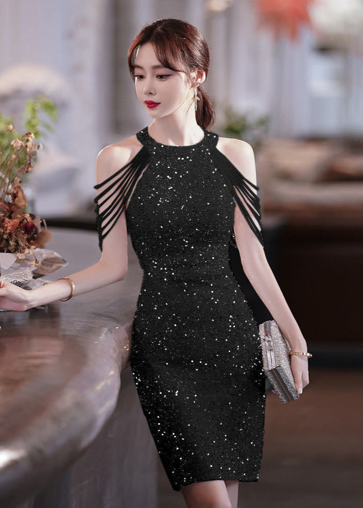Préparez-vous à faire tourner les têtes. Cette robe ultra-glamour, entièrement ornée de sequins scintillants, est la pièce maîtresse de toutes vos soirées. Sa coupe ajustée sublime les courbes, tandis que les chaînes perlées sur les épaules apportent une touche de sophistication unique.