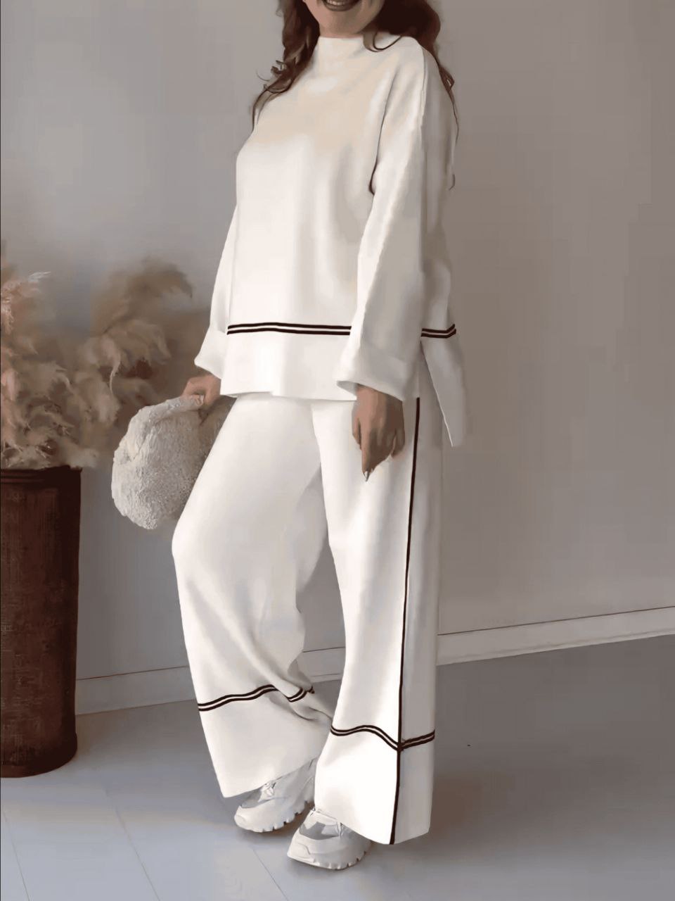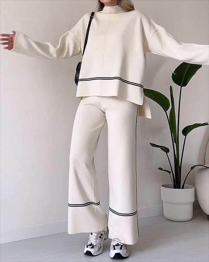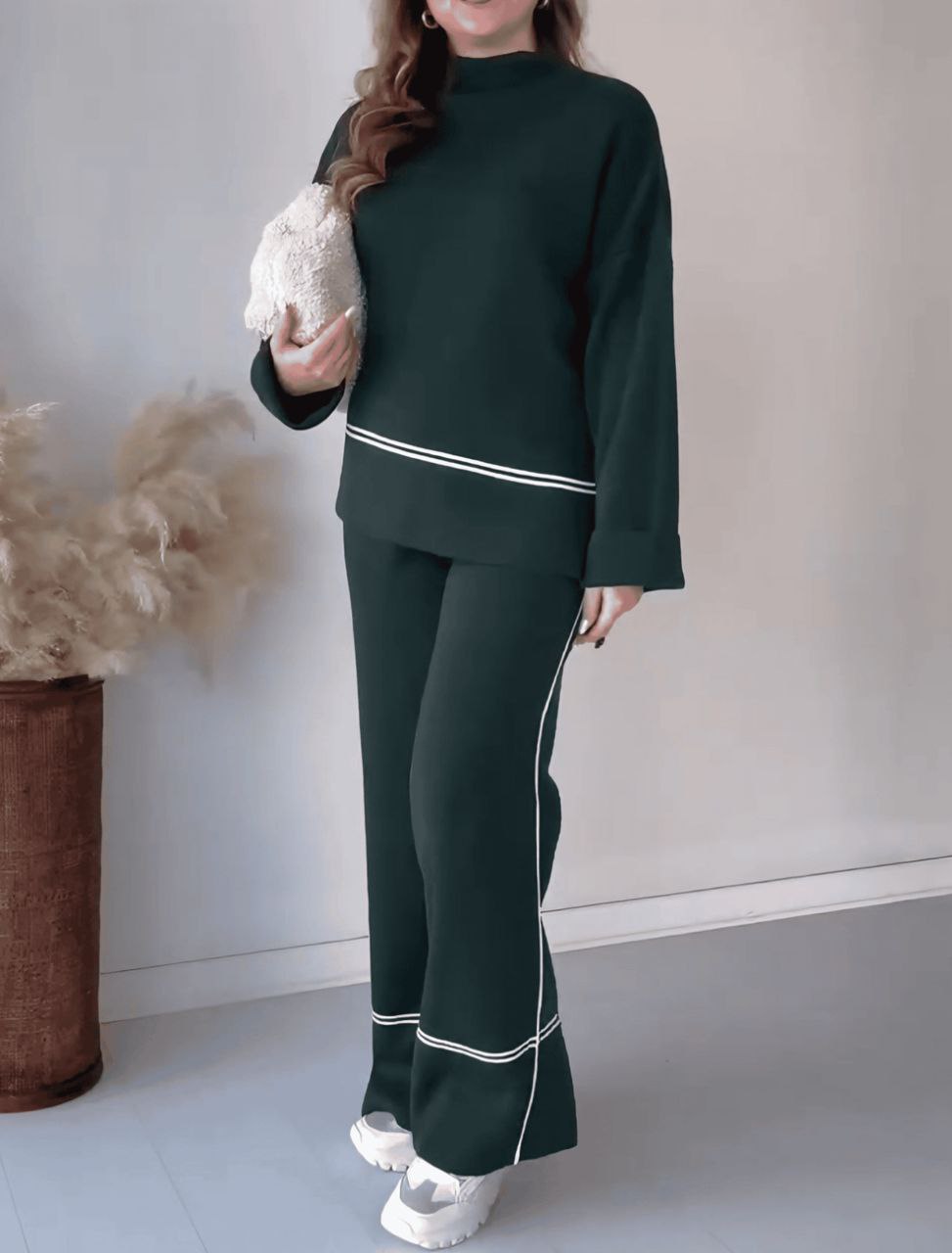 Ce tricoté doux, composé d’un pull à col rond et d’un pantalon à jambes larges, vous offre l’équilibre parfait entre liberté de mouvement et style. "Serena" prouve qu’il est possible d’être à la fois élégante et décontractée, sans renoncer à la sensation de confort absolu.