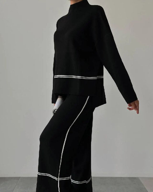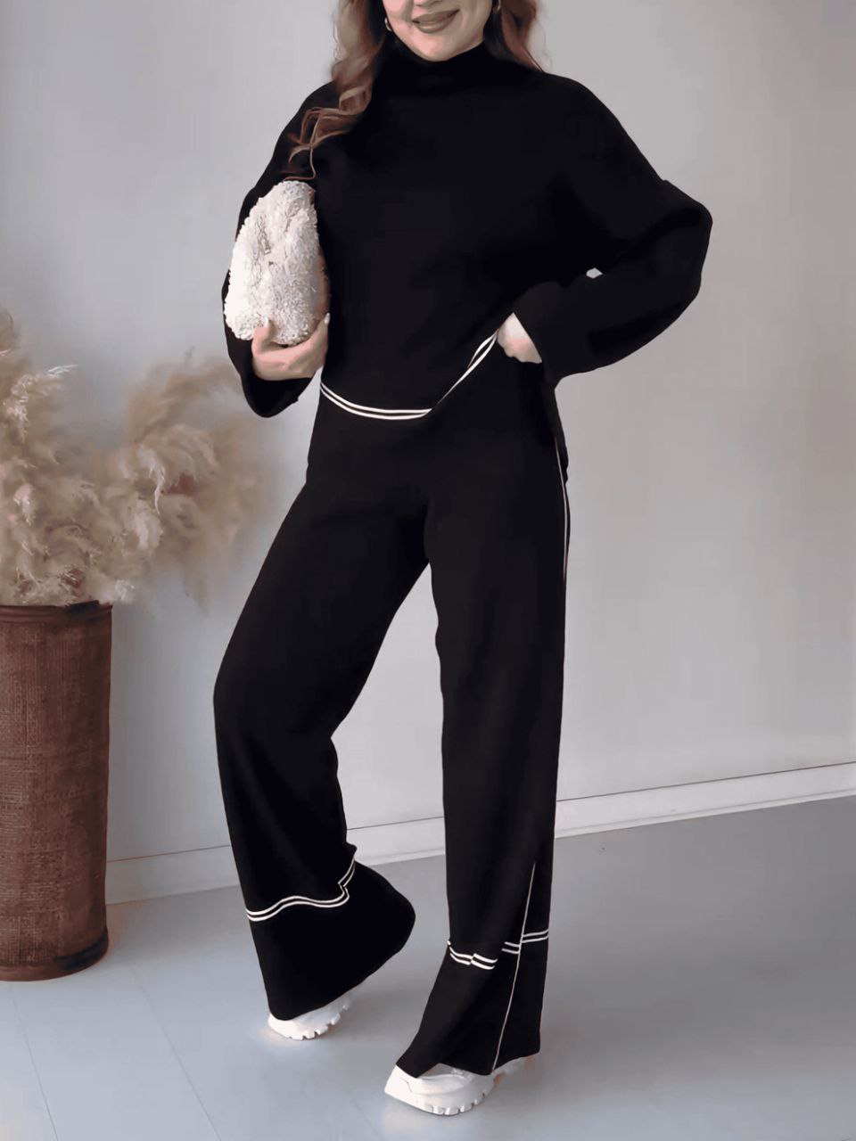 Le pull fluide, sublimé par une fente latérale subtile, crée une silhouette moderne et dynamique. Le pantalon, avec sa ceinture élastique, garantit un ajustement impeccable tout en offrant une grande liberté de mouvement. La matière tricotée est douce, chaude, mais jamais encombrante.